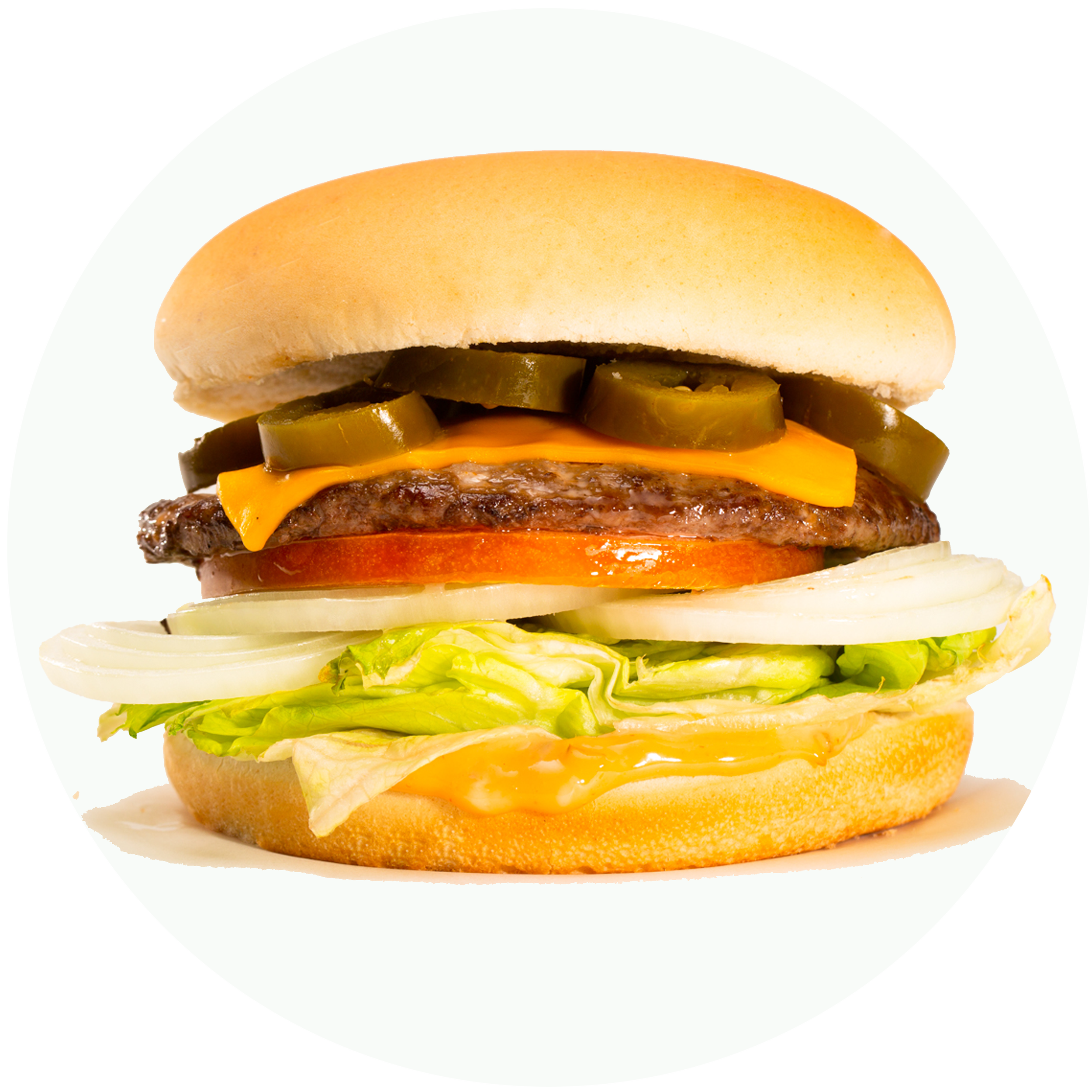 Back Jalapeno Cheeseburger 100% Grass-Fed Beef Burger includes jalapeno, American cheese, lettuce, tomato, onions & Thousand island on a burger bun. $9.69 Order